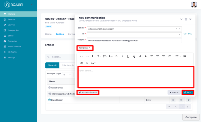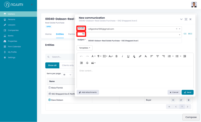 - Select the sender and recipients under the Sender and To fields. Note that in order to minimize error, you are only able to send emails to contacts that have been added as Entities of the Matter